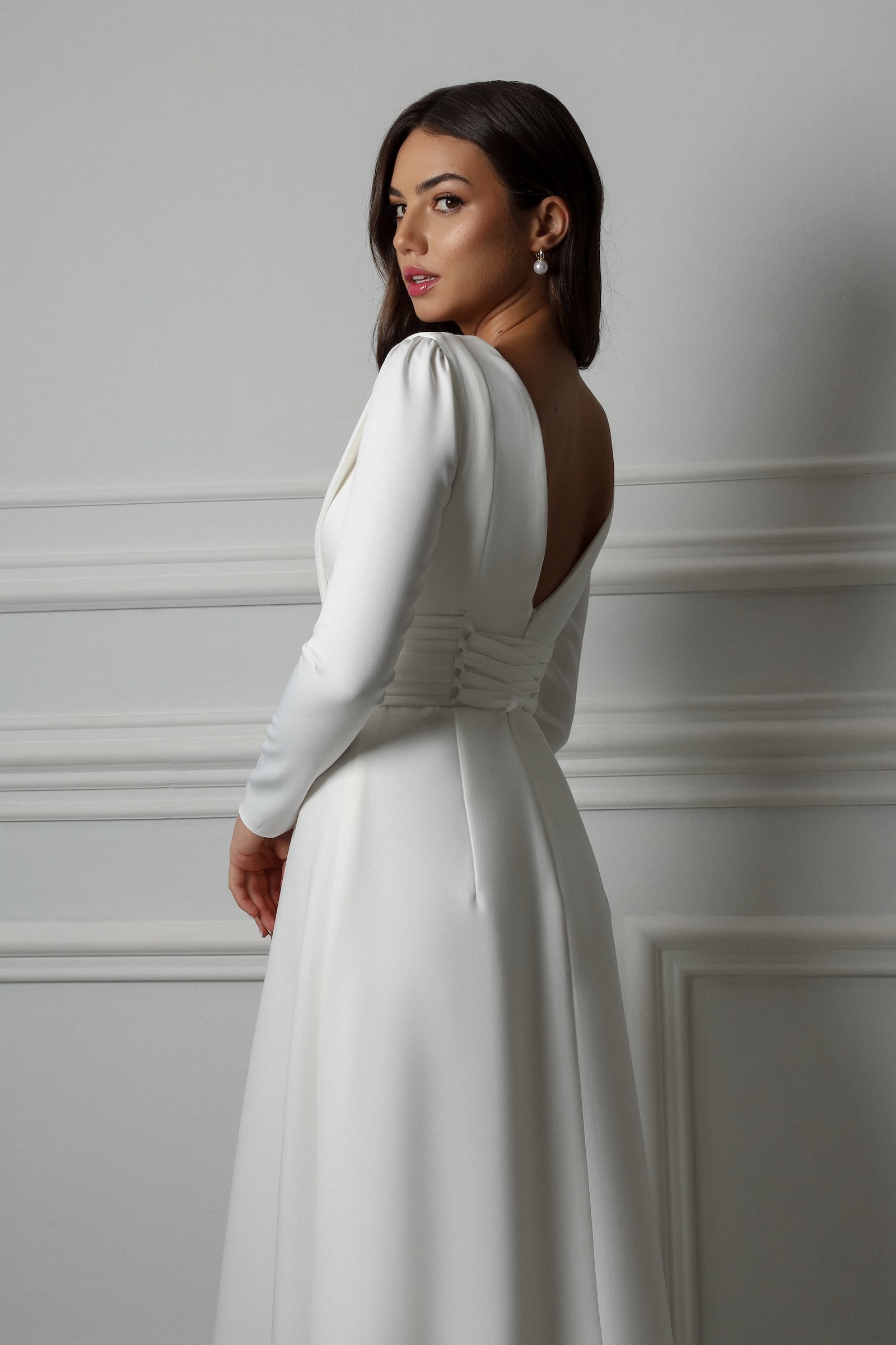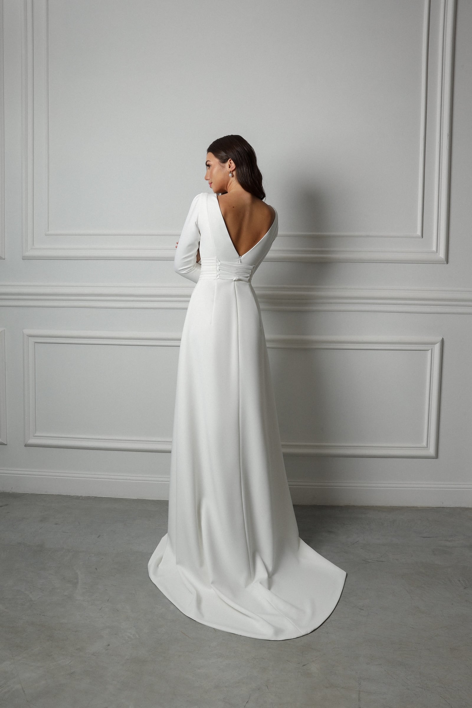 Robe en satin avec manche,avec fonte, tirette zipe dans le dos avec lacets, avec un decolleté V devant et dans le dos avec une petite traine